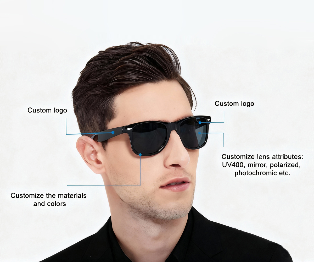 You can customize eyewear with your logo, which is usually printed on the outside and inside of the temples, or on the edges of lenses.